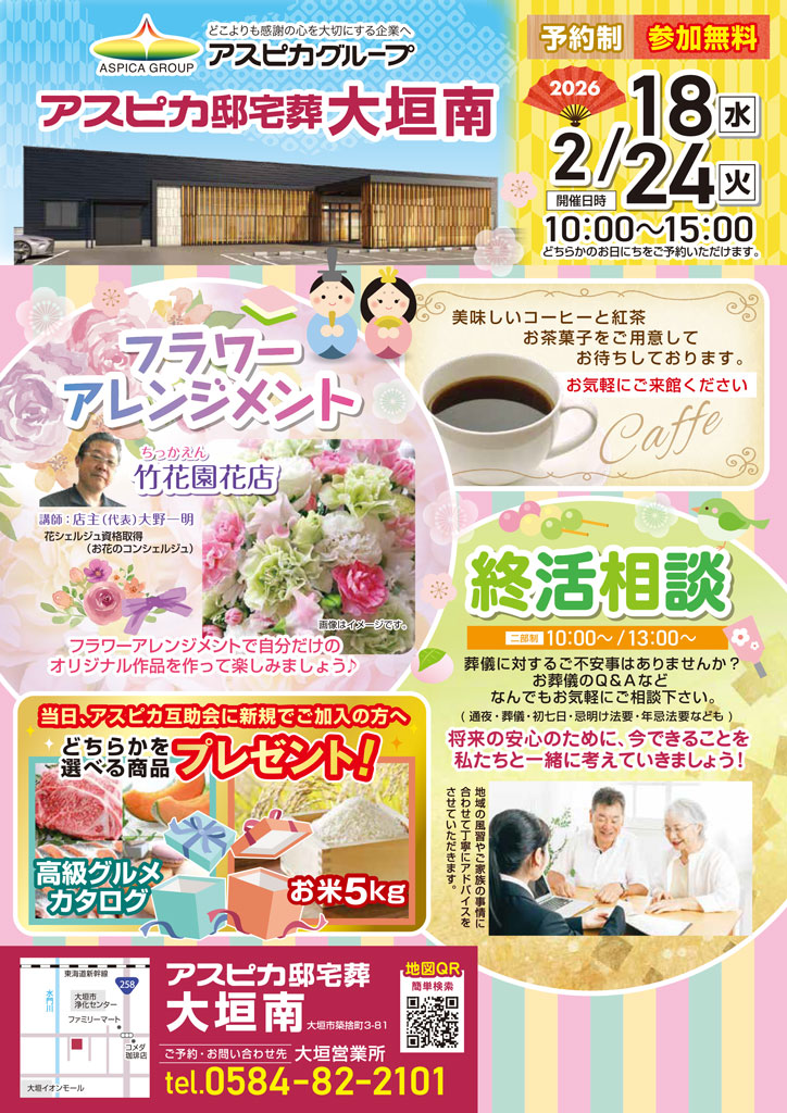 2/18(水)・24(火)にアスピカ邸宅葬 大垣南にてフラワーアレジメント・終活相談を開催いたします。