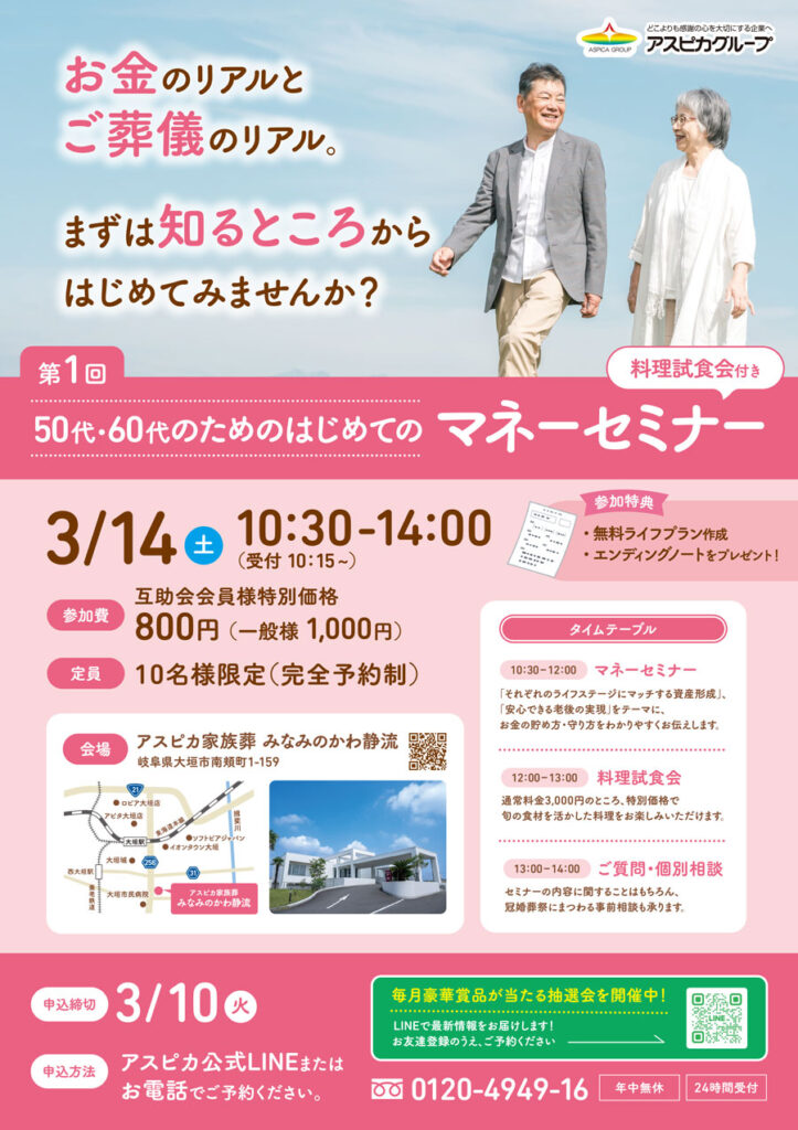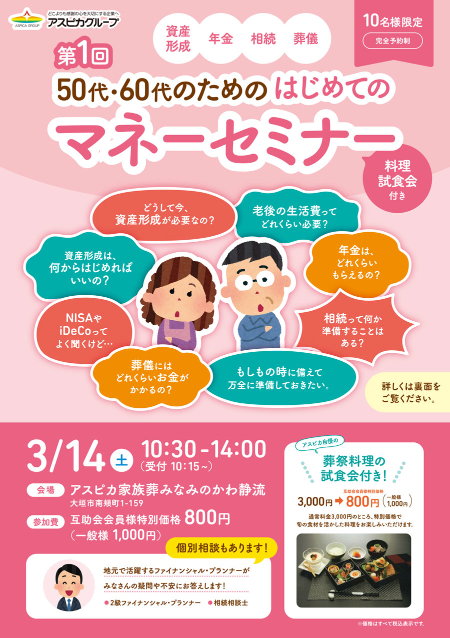 3/14(土)にアスピカ家族葬 みなみのかわ静流にて、第1回 50代・60代のためのはじめてのマネーセミナー(料理試食付き)を開催いたします。