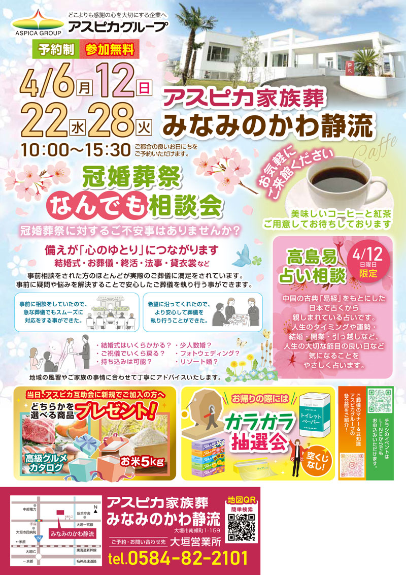 4/6(月)・12(日)・22(水)・28(火)にアスピカ家族葬みなみのかわ静流にて冠婚葬祭なんでも相談会を開催いたします。