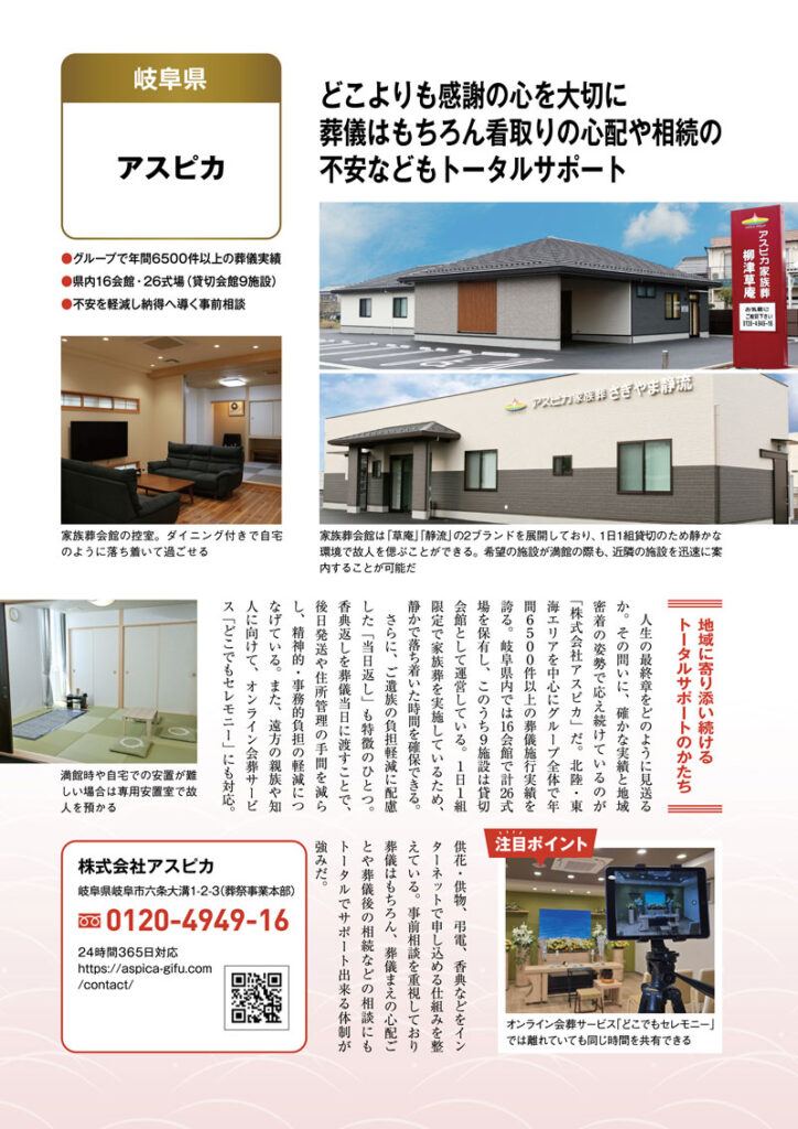 2026.04.07 お知らせ 文藝春秋の特別編集「文春ムック」にアスピカが掲載されました。 文藝春秋の特別編集「文春ムック」にアスピカが掲載されました。今回の企画では、読者に「安心できる葬儀社選び」の指針をお届けするべく、全国から厳選した47社の取り組みを、各県1社に絞ってのご紹介です。以下画像リンクより詳細をご閲覧ください。