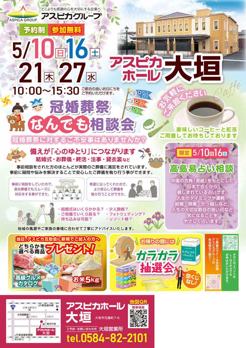 5/10(日)・16(土)・21(木)・27(水)にアスピカホール大垣にて冠婚葬祭なんでも相談会を開催いたします。